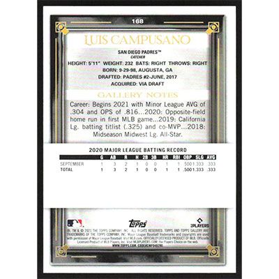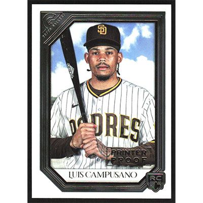 This is a 2021 Topps Gallery Printer Proofs Luis Campusano baseball card. The card is #168 and pictures show condition. Team(s): San Diego Padres Rookie Card (RC)