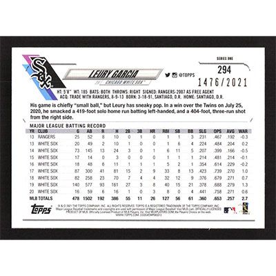 This is a 2021 Topps Gold Leury Garcia baseball card. The card is #294 and pictures show condition. This card is limited; #'d 1476/2021. Team(s): Chicago White Sox