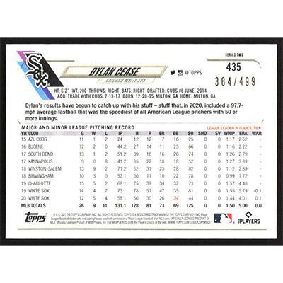 This is a 2021 Topps Green Foil Dylan Cease Future Stars baseball card. The card is #435 and pictures show condition. This card is limited; #'d 384/499.