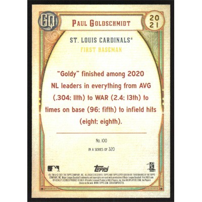 This is a 2021 Topps Gypsy Queen Paul Goldschmidt baseball card. The card is #100 and pictures show condition.