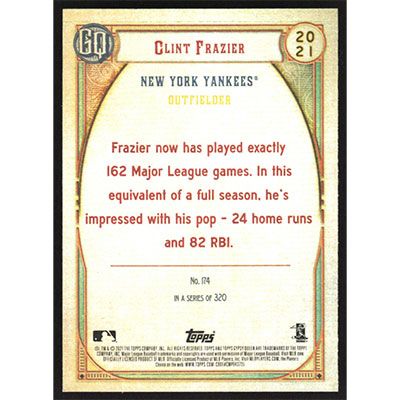 This is a 2021 Topps Gypsy Queen Clint Frazier baseball card. The card is #174 and pictures show condition.
