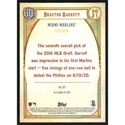 This is a 2021 Topps Gypsy Queen Braxton Garrett baseball card. The card is #227 and pictures show condition.