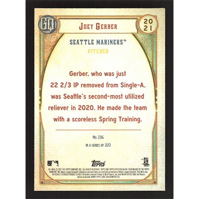 This is a 2021 Topps Gypsy Queen Joey Gerber baseball card. The card is #236 and pictures show condition.