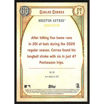 This is a 2021 Topps Gypsy Queen Carlos Correa baseball card. The card is #55 and pictures show condition.