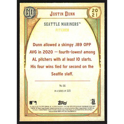 This is a 2021 Topps Gypsy Queen Justin Dunn baseball card. The card is #66 and pictures show condition.