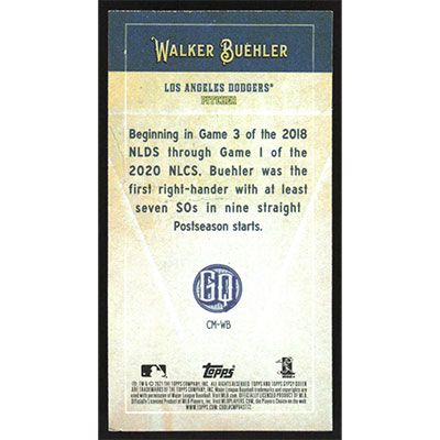 This is a 2021 Topps Gypsy Queen Captains Mini Walker Buehler baseball card. The card is #CM-WB and pictures show condition. Team(s): Los Angeles Dodgers