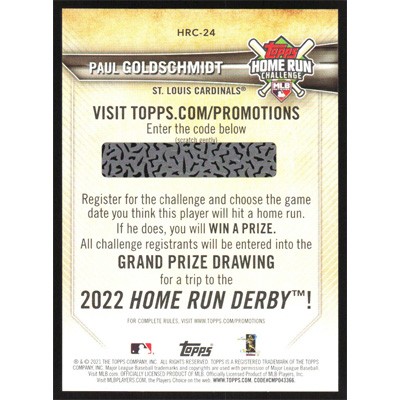 This is a 2021 Topps Home Run Challenge Code Cards Paul Goldschmidt baseball card. The card is #HRC-24 and pictures show condition. Team(s): St. Louis Cardinals