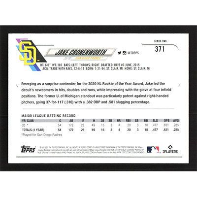This is a 2021 Topps Rainbow Foil Jake Cronenworth baseball card. The card is #371 and pictures show condition. Team(s): San Diego Padres Rookie Card (RC)