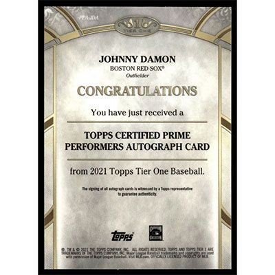 This is a 2021 Topps Tier One Prime Performers Autographs Johnny Damon autographed baseball card. This card has been signed, in blue, by Johnny Damon, and is certified authentic by Topps. The card is #PPA-JDA and pictures show condition. This card is limited; #'d 060/300.
