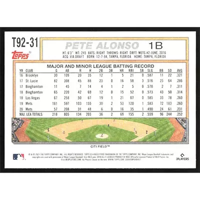 This is a 2021 Topps Update '92 Redux Pete Alonso baseball card. The card is #T92-31 and pictures show condition.