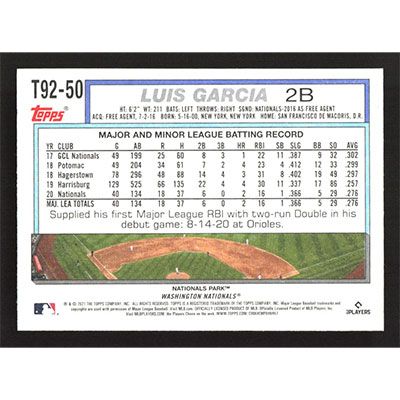 This is a 2021 Topps Update '92 Redux Luis Garcia baseball card. The card is #T92-50 and pictures show condition. Team(s): Washington Nationals Rookie Card (RC)