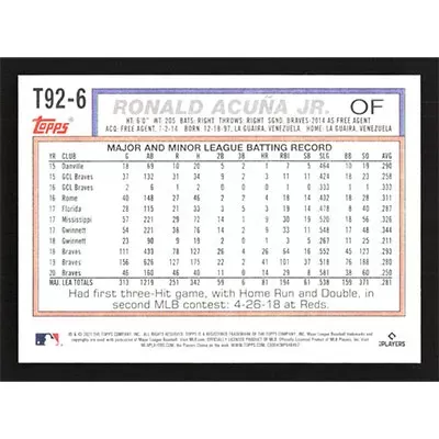This is a 2021 Topps Update '92 Redux Ronald Acuña Jr. baseball card. The card is #T92-6 and pictures show condition.