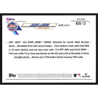 This is a 2021 Topps Update MLB All-Stars Jacob deGrom baseball card. The card is #ASG-12 and pictures show condition.