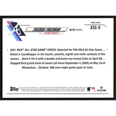 This is a 2021 Topps Update MLB All-Stars Freddie Freeman baseball card. The card is #ASG-8 and pictures show condition.