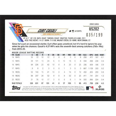 This is a 2021 Topps Update Red Foilboard Curt Casali baseball card. The card is #US202 and pictures show condition. This card is limited; #'d 035/199.