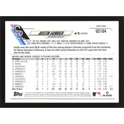 This is a 2021 Topps Update Austin Gomber baseball card. The card is #US104 and pictures show condition.