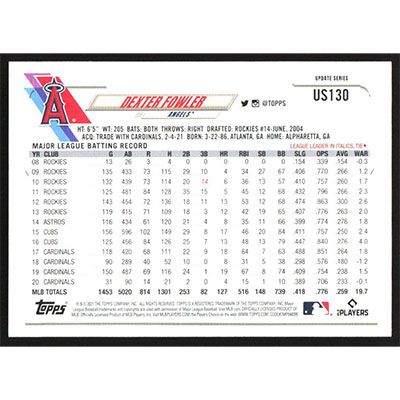 This is a 2021 Topps Update Dexter Fowler baseball card. The card is #US130 and pictures show condition.