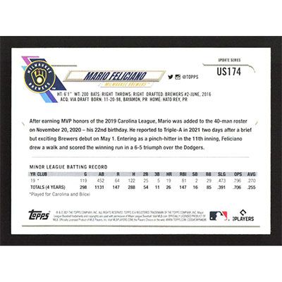 This is a 2021 Topps Update Mario Feliciano baseball card. The card is #US174 and pictures show condition. Team(s): Milwaukee Brewers Rookie Card (RC)