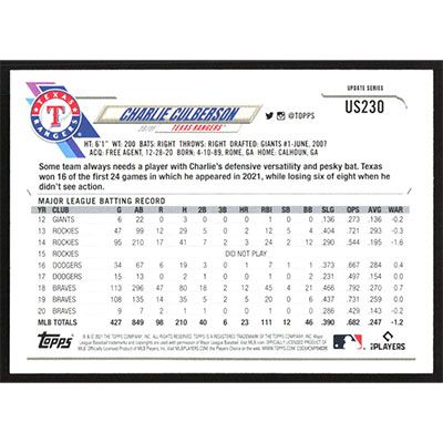 This is a 2021 Topps Update Charlie Culberson baseball card. The card is #US230 and pictures show condition.