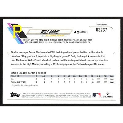 This is a 2021 Topps Update Will Craig baseball card. The card is #US237 and pictures show condition.