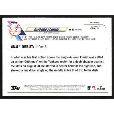 This is a 2021 Topps Update Estevan Florial Rookie Debut baseball card. The card is #US247 and pictures show condition. Team(s): New York Yankees Rookie Card (RC)