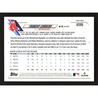 This is a 2021 Topps Update Franchy Cordero baseball card. The card is #US96 and pictures show condition.