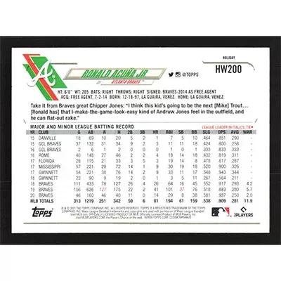 This is a 2021 Topps Wal-Mart Holiday Metallic Ronald Acuña Jr. baseball card. The card is #HW200 and pictures show condition.