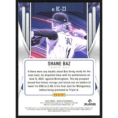 This is a 2022 Absolute Rookie Class Retail Green Shane Baz baseball card. The card is #RC-23 and pictures show condition.
