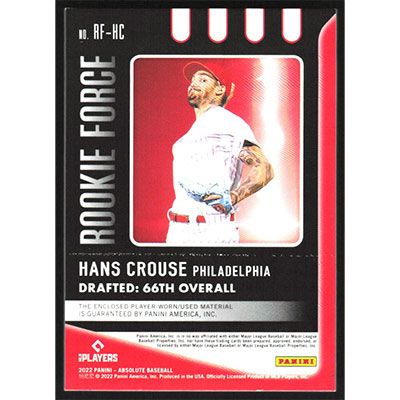 This is a 2022 Absolute Rookie Force Materials Retail Hans Crouse Jersey with Pinstripe baseball card. The card is #RF-HC and pictures show condition. Team(s): Philadelphia Phillies Rookie Card (RC)