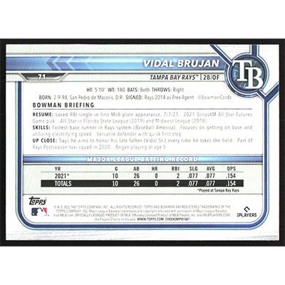 This is a 2022 Bowman Vidal Brujan baseball card. The card is #71 and pictures show condition.