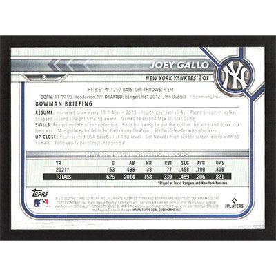 This is a 2022 Bowman Joey Gallo baseball card. The card is #8 and pictures show condition.