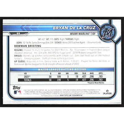 This is a 2022 Bowman Bryan De La Cruz baseball card. The card is #88 and pictures show condition.