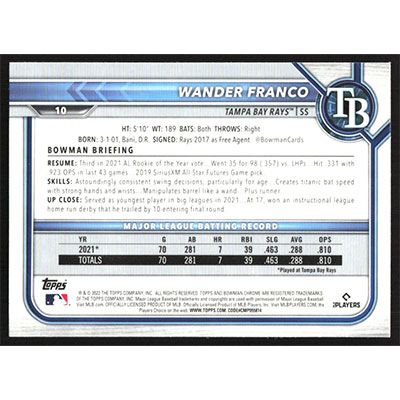 This is a 2022 Bowman Chrome Wander Franco baseball card. The card is #10 and pictures show condition.