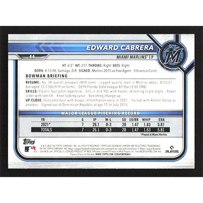 This is a 2022 Bowman Chrome Edward Cabrera baseball card. The card is #44 and pictures show condition.