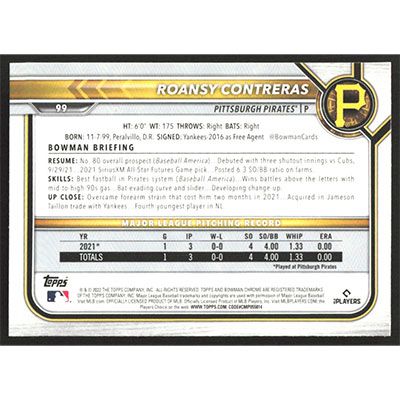 This is a 2022 Bowman Chrome Roansy Contreras baseball card. The card is #99 and pictures show condition. Team(s): Pittsburgh Pirates Rookie Card (RC)