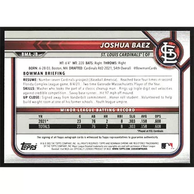 This is a 2022 Bowman Chrome Mega Box Autographs Joshua Baez autographed baseball card. This card has been signed, in blue, by Joshua Baez, and is certified authentic by Topps. The card is #BMA-JB and pictures show condition.