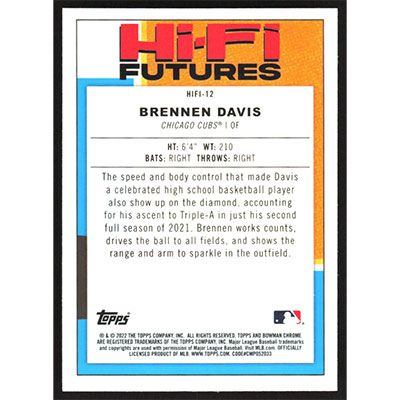 This is a 2022 Bowman Chrome Mega Box Hi-Fi Futures Brennen Davis baseball card. The card is #HIFI-12 and pictures show condition.