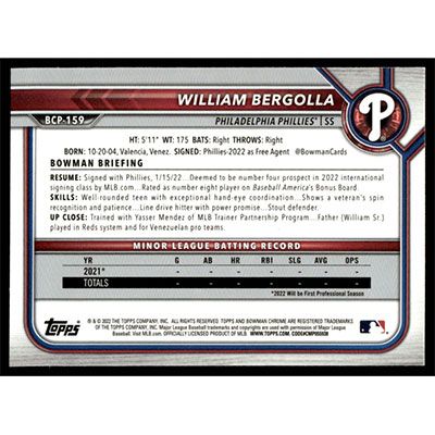 This is a 2022 Bowman Chrome Mega Box Prospects William Bergolla baseball card. The card is #BCP-159 and pictures show condition. Team(s): Philadelphia Phillies