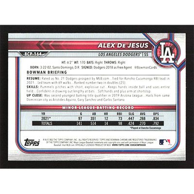 This is a 2022 Bowman Chrome Mega Box Prospects Alex De Jesus baseball card. The card is #BCP-164 and pictures show condition. Team(s): Los Angeles Dodgers