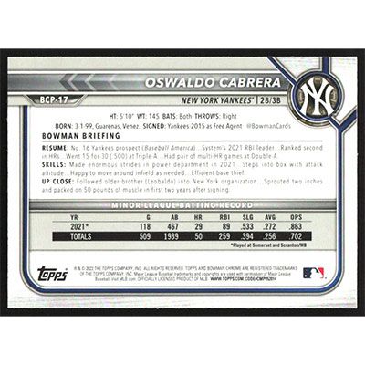 This is a 2022 Bowman Chrome Mega Box Prospects Oswaldo Cabrera baseball card. The card is #BCP-17 and pictures show condition.