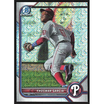 This is a 2022 Bowman Chrome Mega Box Prospects Yhoswar Garcia baseball card. The card is #BCP-215 and pictures show condition. Team(s): Philadelphia Phillies