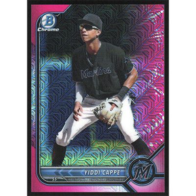 This is a 2022 Bowman Chrome Mega Box Prospects Pink Refractors Yiddi Cappe baseball card. The card is #BCP-248 and pictures show condition. This card is limited; #'d 144/199.