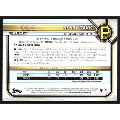 This is a 2022 Bowman Chrome Prospects Henry Davis baseball card. The card is #BCP-148 and pictures show condition.