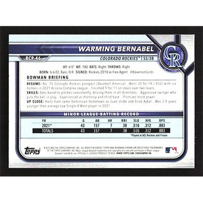 This is a 2022 Bowman Chrome Prospects Warming Bernabel baseball card. The card is #BCP-46 and pictures show condition.
