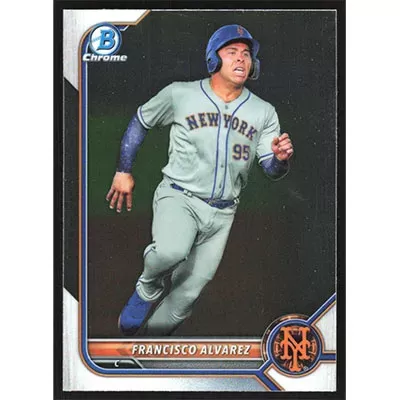 This is a 2022 Bowman Chrome Prospects Francisco Alvarez baseball card. The card is #BCP-53 and pictures show condition.