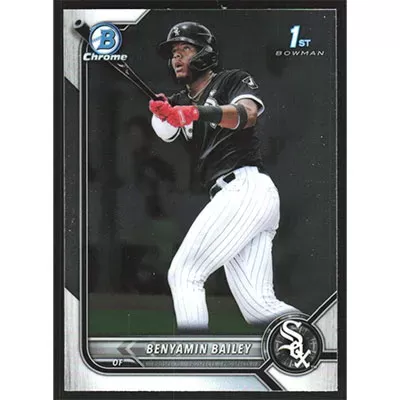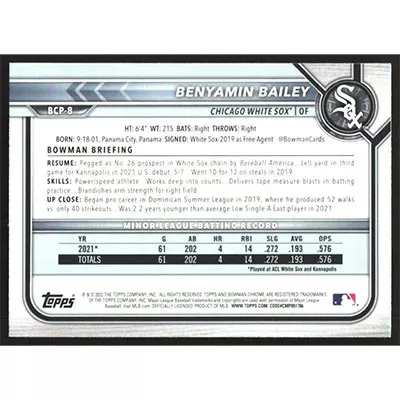 This is a 2022 Bowman Chrome Prospects Benyamin Bailey baseball card. The card is #BCP-8 and pictures show condition.
