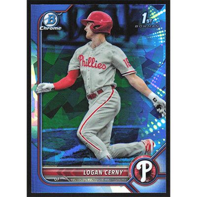 This is a 2022 Bowman Chrome Sapphire Prospects Logan Cerny baseball card. The card is #BCP-120 and pictures show condition. Team(s): Philadelphia Phillies