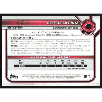 This is a 2022 Bowman Chrome Sapphire Prospects Elly De La Cruz baseball card. The card is #BCP-50 and pictures show condition.