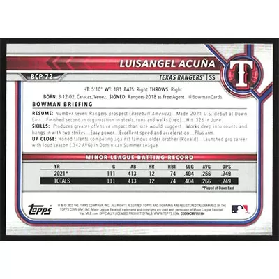 This is a 2022 Bowman Chrome Sapphire Prospects Luisangel Acuña baseball card. The card is #BCP-72 and pictures show condition.