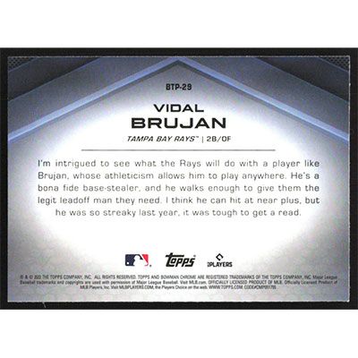 This is a 2022 Bowman Chrome Scouts Top 100 Vidal Brujan baseball card. The card is #BTP-29 and pictures show condition. Team(s): Tampa Bay Rays Rookie Card (RC)